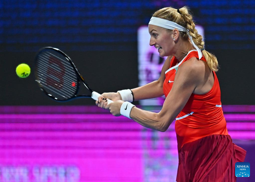 Petra Kvitova of the Czech Republic returns the ball during the first round of WTA Qatar Open tennis tournament match against Irina-Camelia Begu of Romania at the Khalifa International Tennis Complex in Doha, capital of Qatar, on Feb. 21, 2022. (Photo by Nikku/Xinhua)