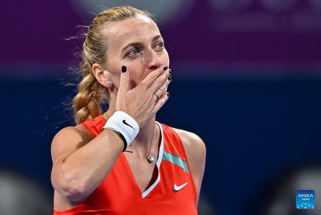 Petra Kvitova of the Czech Republic celebrates after winning the first round of WTA Qatar Open tennis tournament match against Irina-Camelia Begu of Romania at the Khalifa International Tennis Complex in Doha, capital of Qatar, on Feb. 21, 2022. (Photo by Nikku/Xinhua)