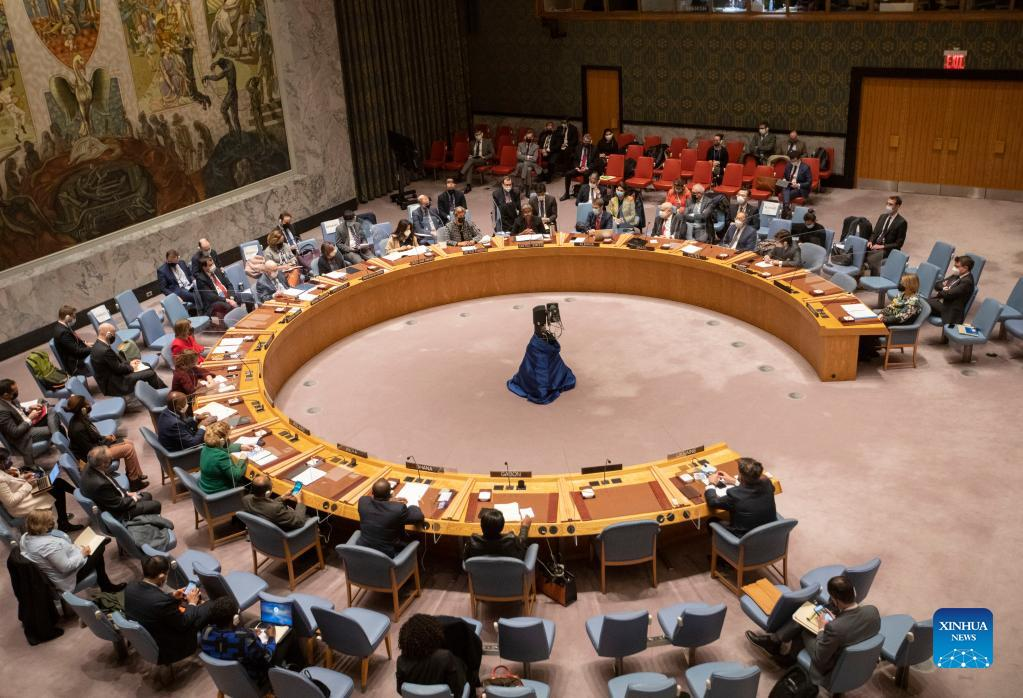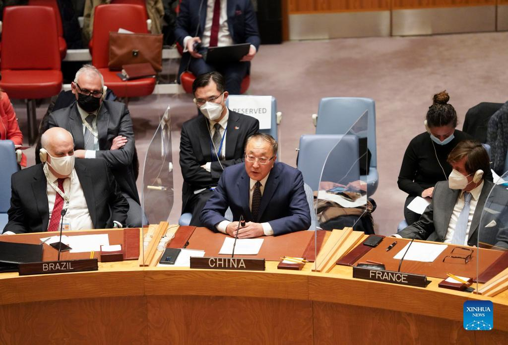Photo taken on Feb. 21, 2022 shows the scene of the UN Security Council emergency meeting on Ukraine at UN headquarters in New York. China's permanent representative to the United Nations, Zhang Jun, on Monday called on all parties concerned to seek "reasonable solutions" to the Ukraine issue. (Xinhua/Wang Ying)