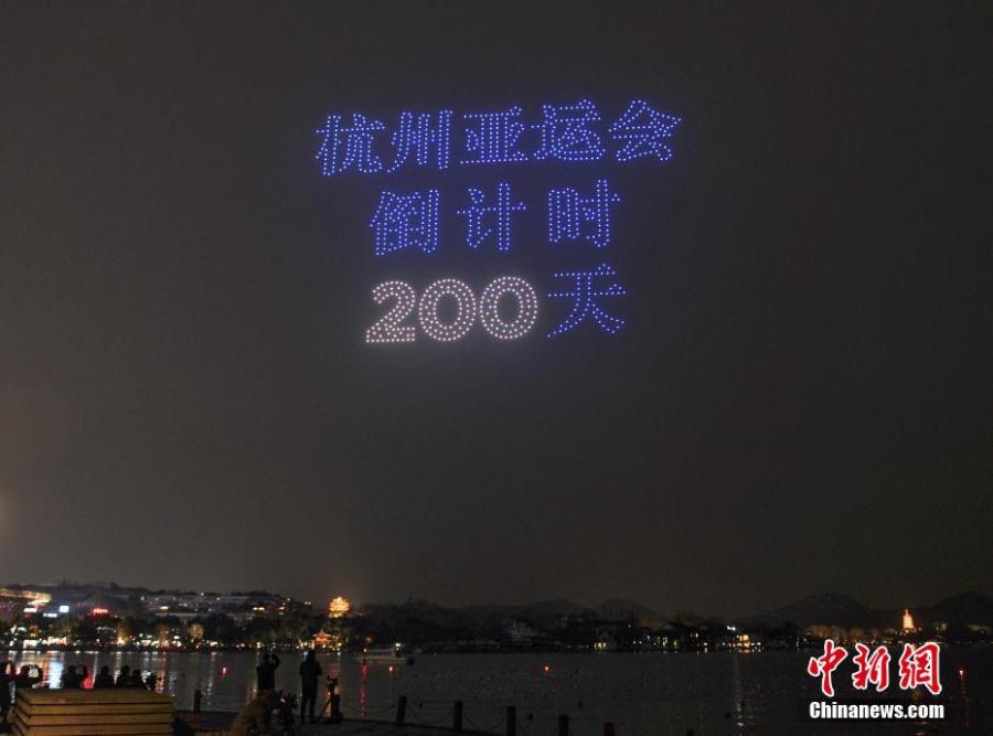 Over 1,000 illuminated drones display Chinese characters of "200-day countdown to Hangzhou Asia Games" in the night sky above the West Lake to welcome the 200-day countdown to the 19th Asia Games in Hangzhou, capital city of east China's Zhejiang Province, Feb. 21,2022. (Photo: China News Service/Wang Gang)