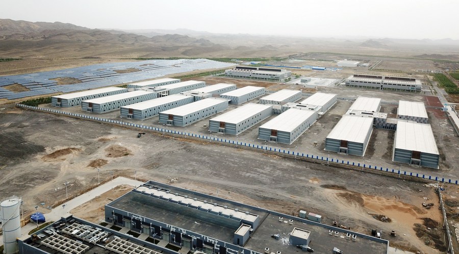 Aerial photo taken on May 31, 2019 shows a cloud computing base under construction in Zhongwei City, northwest China's Ningxia Hui Autonomous Region. (Xinhua/Ding Hongfa)