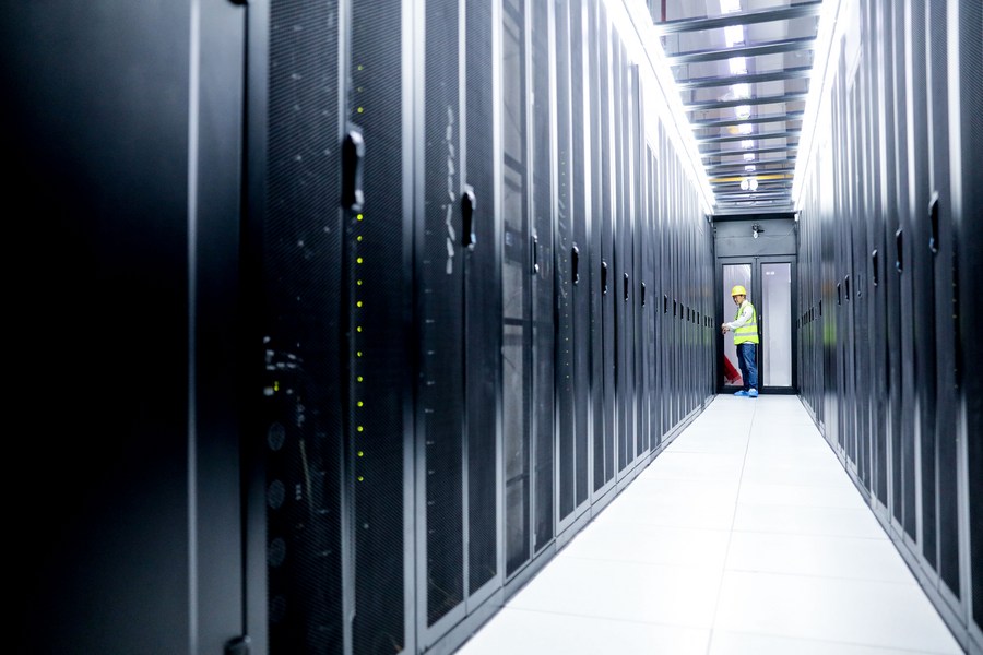 A staff member checks equipment at a data center of China Mobile in Gui'an New Area of southwest China's Guizhou Province, May 24, 2021. (Xinhua/Ou Dongqu)