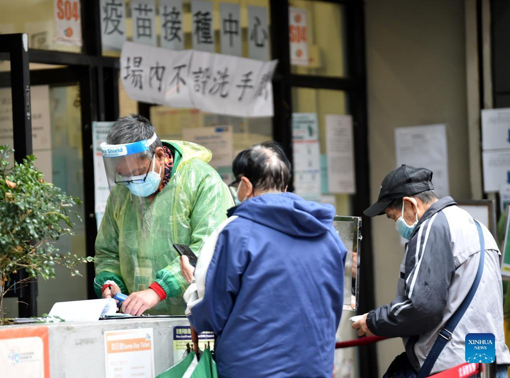 Citizens queue up to take COVID-19 vaccines at a vaccination site in Hong Kong, south China, Feb. 22, 2022. Hong Kong reported 6,211 new COVID-19 cases on Tuesday, official data showed. (Xinhua/Lo Ping Fai)