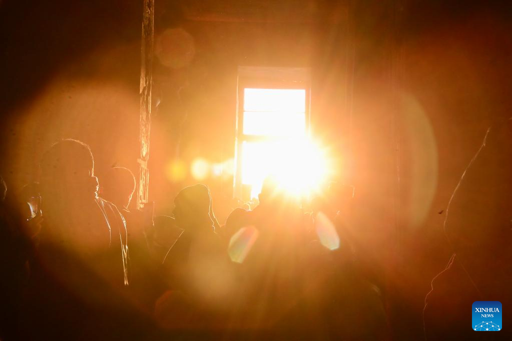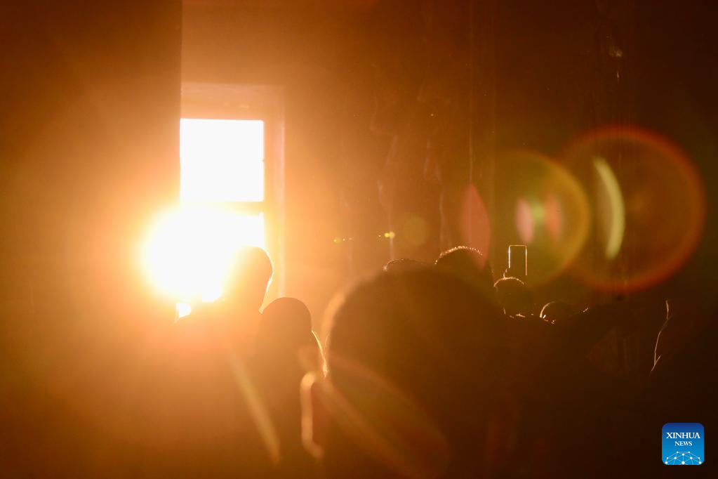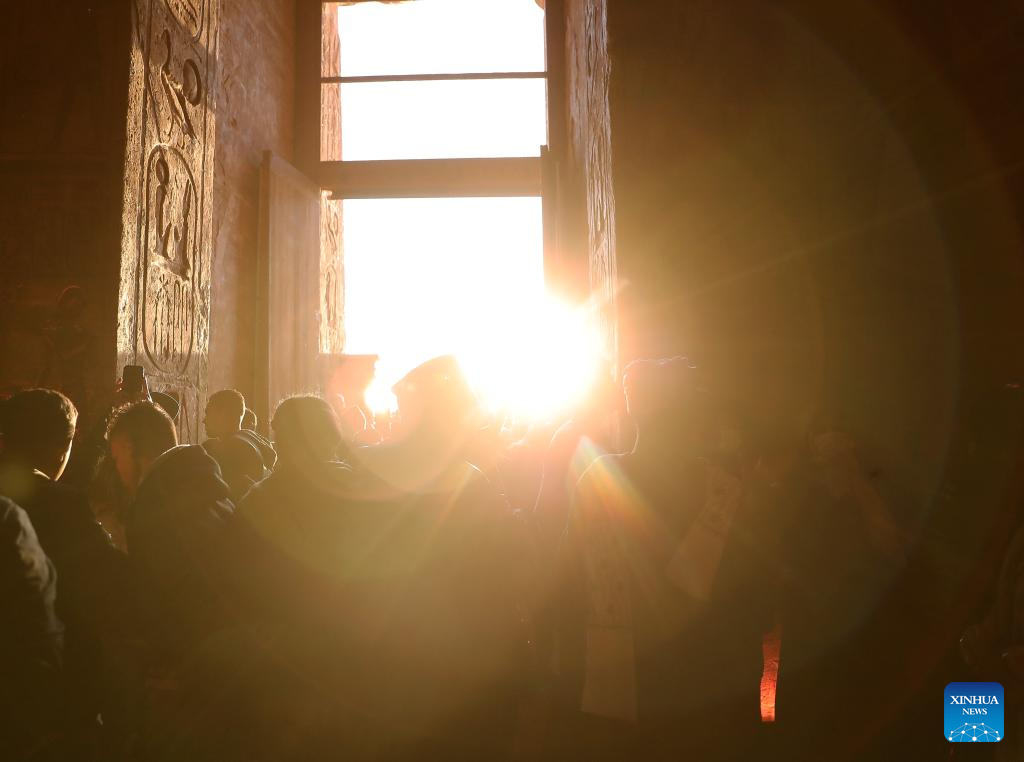 Photo taken on Feb. 22, 2022 shows a ray of sunlight showering into the Great Temple of Abu Simbel during the Sun Festival in Aswan, Egypt. During the Sun Festival, crowds gather before sunrise to observe sunlight lightening the innermost sculptures including King Ramses II. The innermost sculptures remain in darkness inside the Great Temple of Abu Simbel throughout the year except on Feb. 22 and Oct. 22, when the sunlight showers on the sculptures to commemorate the king's coronation and birthday. (Xinhua/Wang Dongzhen)