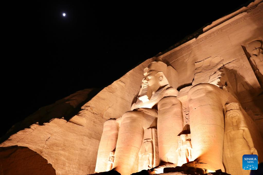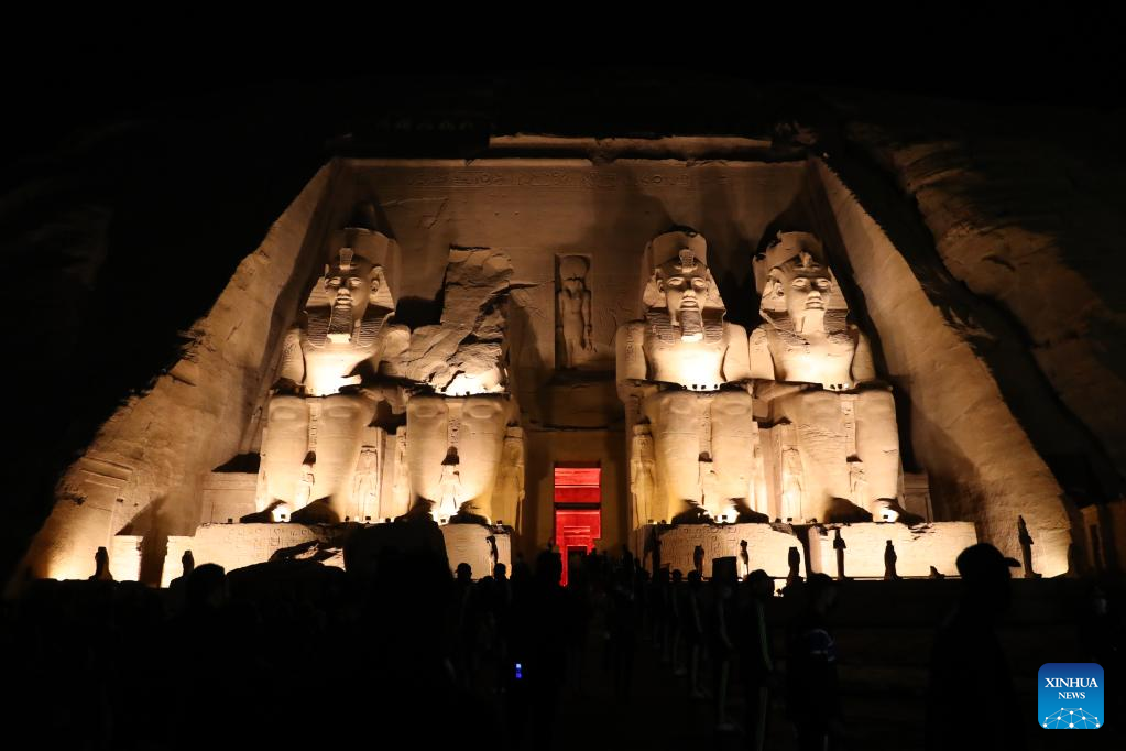 The sculptures of the Great Temple of Abu Simbel are lit up during the Sun Festival in Aswan, Egypt, Feb. 22, 2022. During the Sun Festival, crowds gather before sunrise to observe sunlight lightening the innermost sculptures including King Ramses II. The innermost sculptures remain in darkness inside the Great Temple of Abu Simbel throughout the year except on Feb. 22 and Oct. 22, when the sunlight showers on the sculptures to commemorate the king's coronation and birthday. (Xinhua/Sui Xiankai)