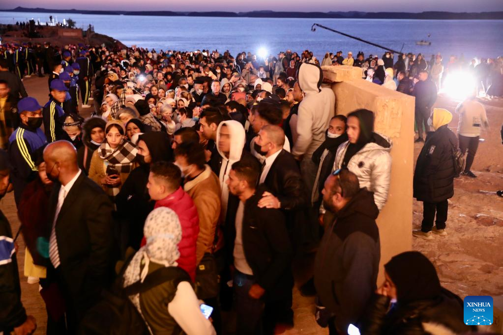 Tourists gather to visit the Great Temple of Abu Simbel during the Sun Festival in Aswan, Egypt, Feb. 22, 2022. During the Sun Festival, crowds gather before sunrise to observe sunlight lightening the innermost sculptures including King Ramses II. The innermost sculptures remain in darkness inside the Great Temple of Abu Simbel throughout the year except on Feb. 22 and Oct. 22, when the sunlight showers on the sculptures to commemorate the king's coronation and birthday. (Xinhua/Wang Dongzhen)