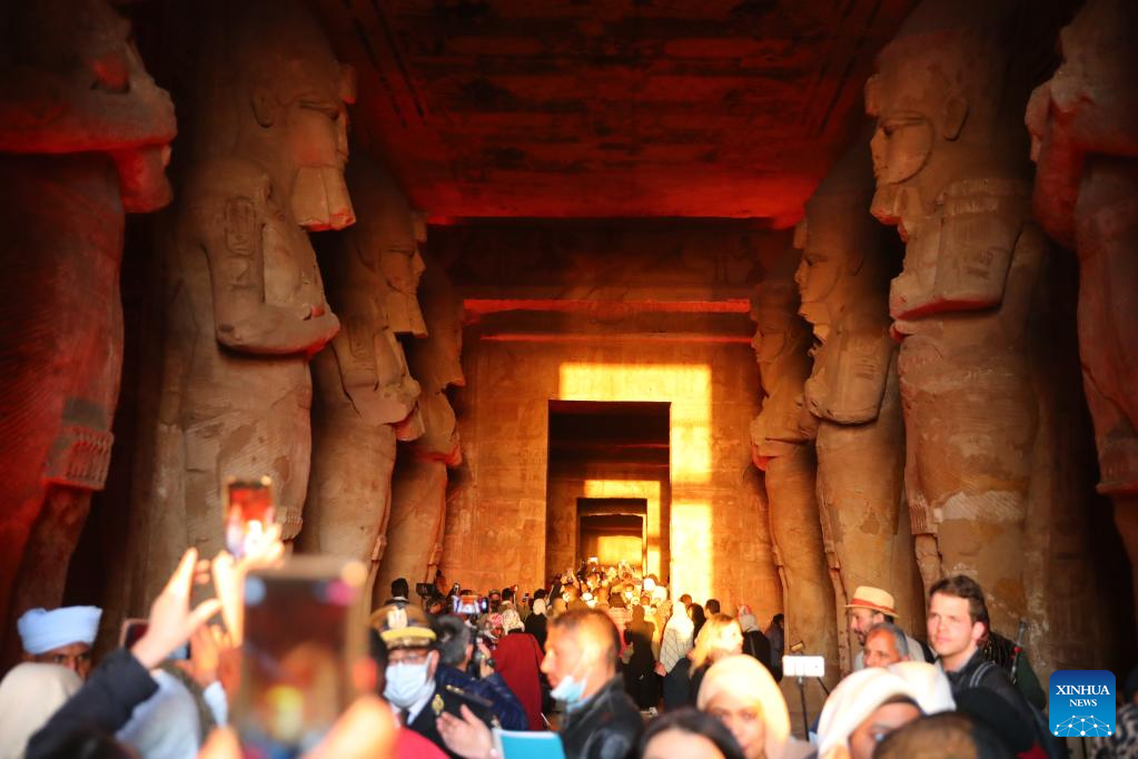 Tourists visit the Great Temple of Abu Simbel during the Sun Festival in Aswan, Egypt, Feb. 22, 2022. During the Sun Festival, crowds gather before sunrise to observe sunlight lightening the innermost sculptures including King Ramses II. The innermost sculptures remain in darkness inside the Great Temple of Abu Simbel throughout the year except on Feb. 22 and Oct. 22, when the sunlight showers on the sculptures to commemorate the king's coronation and birthday. (Xinhua/Wang Dongzhen)