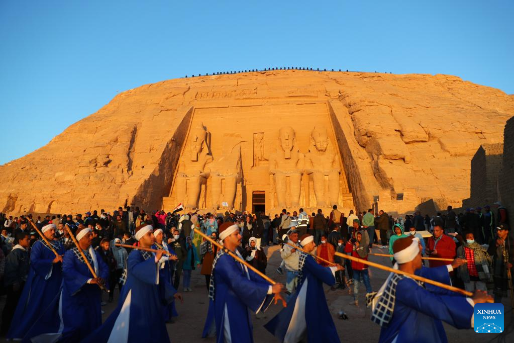 People perform to celebrate the Sun Festival at the Great Temple of Abu Simbel in Aswan, Egypt, Feb. 22, 2022. During the Sun Festival, crowds gather before sunrise to observe sunlight lightening the innermost sculptures including King Ramses II. The innermost sculptures remain in darkness inside the Great Temple of Abu Simbel throughout the year except on Feb. 22 and Oct. 22, when the sunlight showers on the sculptures to commemorate the king's coronation and birthday. (Xinhua/Sui Xiankai)