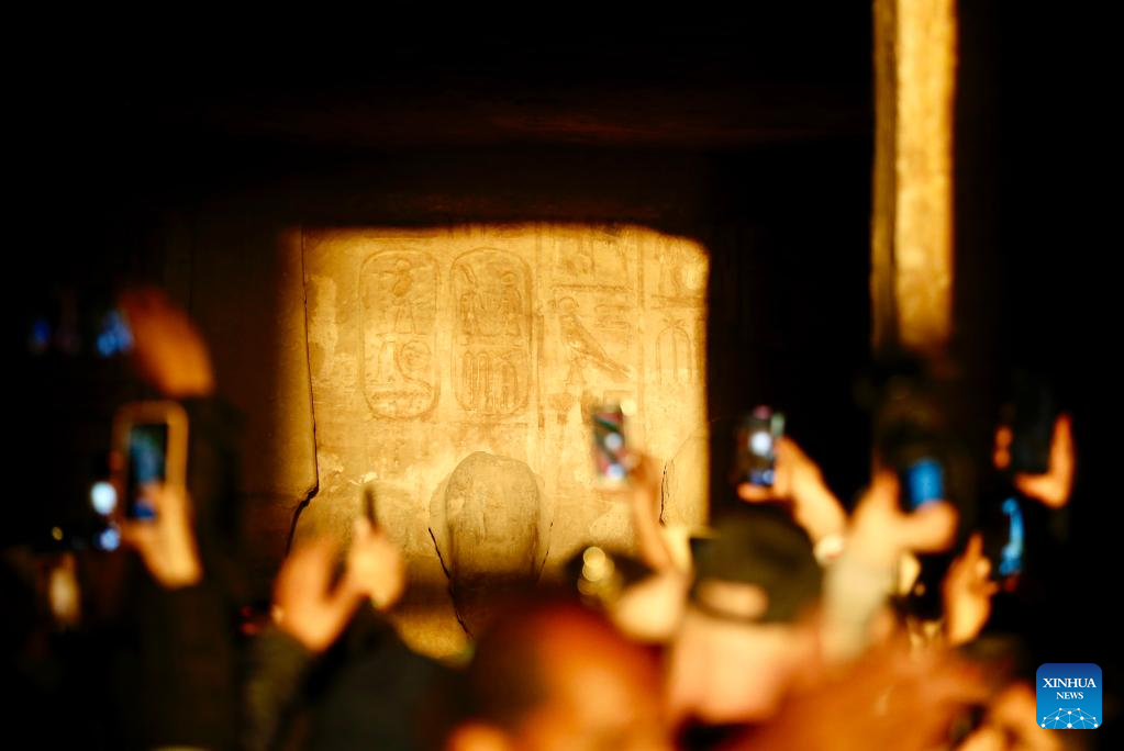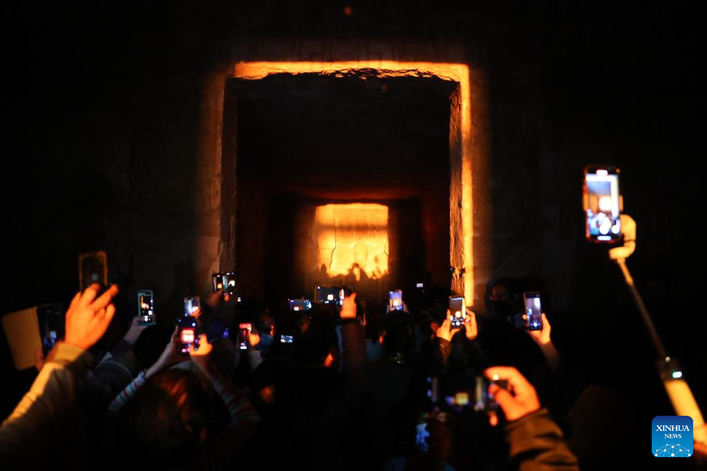 Tourists take photos of sculptures illuminated by a ray of sunlight at the Great Temple of Abu Simbel during the Sun Festival in Aswan, Egypt, Feb. 22, 2022. During the Sun Festival, crowds gather before sunrise to observe sunlight lightening the innermost sculptures including King Ramses II. The innermost sculptures remain in darkness inside the Great Temple of Abu Simbel throughout the year except on Feb. 22 and Oct. 22, when the sunlight showers on the sculptures to commemorate the king's coronation and birthday. (Xinhua/Wang Dongzhen)