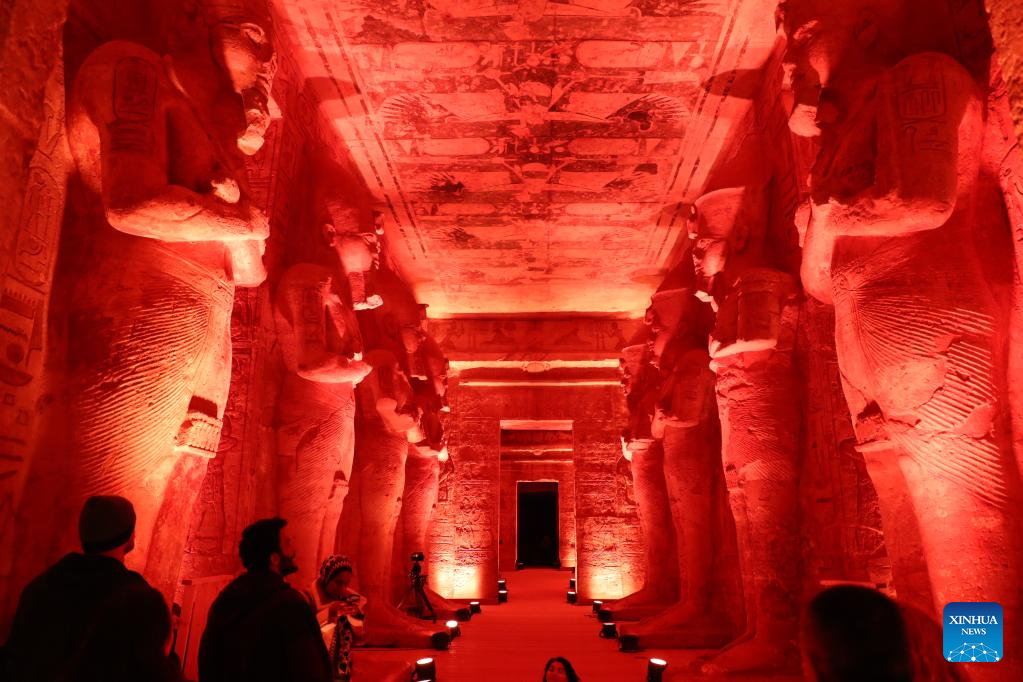 Photo taken on Feb. 22, 2022 shows the lit-up interior of the Great Temple of Abu Simbel during the Sun Festival in Aswan, Egypt. During the Sun Festival, crowds gather before sunrise to observe sunlight lightening the innermost sculptures including King Ramses II. The innermost sculptures remain in darkness inside the Great Temple of Abu Simbel throughout the year except on Feb. 22 and Oct. 22, when the sunlight showers on the sculptures to commemorate the king's coronation and birthday. (Xinhua/Sui Xiankai)