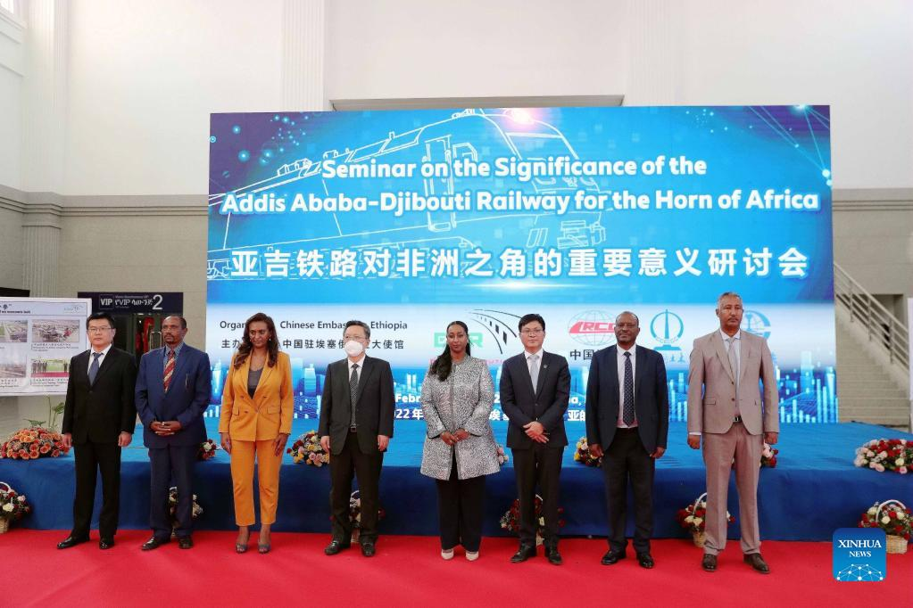 Representatives from China and Ethiopia participate in a ceremony during a seminar themed "Significance of the Addis Ababa-Djibouti Railway for the Horn of Africa" in Addis Ababa, Ethiopia, on Feb. 21, 2022. The Chinese-built Addis Ababa-Djibouti Standard Gauge Railway has won acclaim for facilitating regional integration and prosperity. (Xinhua)