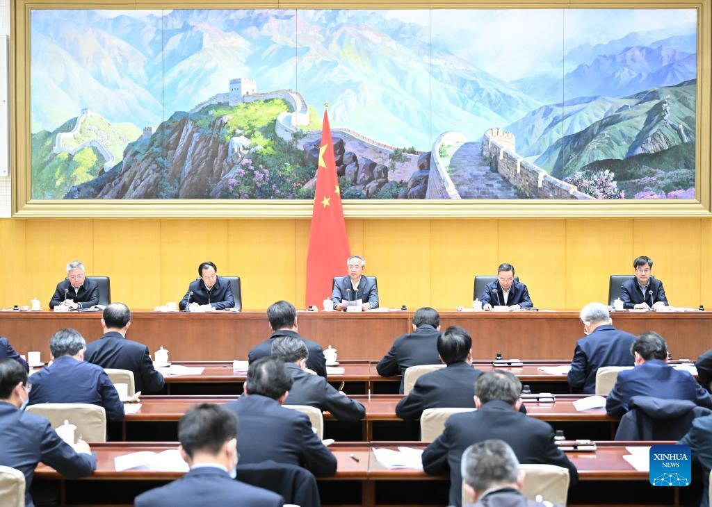 Chinese Vice Premier Hu Chunhua, also a member of the Political Bureau of the Communist Party of China Central Committee, addresses a meeting of the third national soil survey in Beijing, capital of China, Feb. 22, 2022. (Xinhua/Li Xiang)