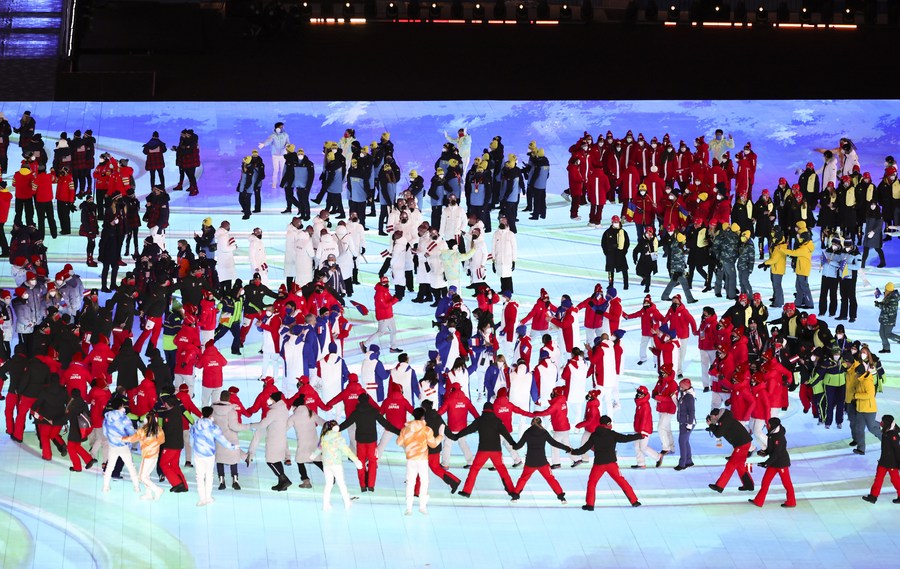 The Olympic delegations parade during the closing ceremony of the Beijing 2022 Olympic Winter Games at the National Stadium in Beijing, Feb. 20, 2022. (Xinhua/Lan Hongguang)