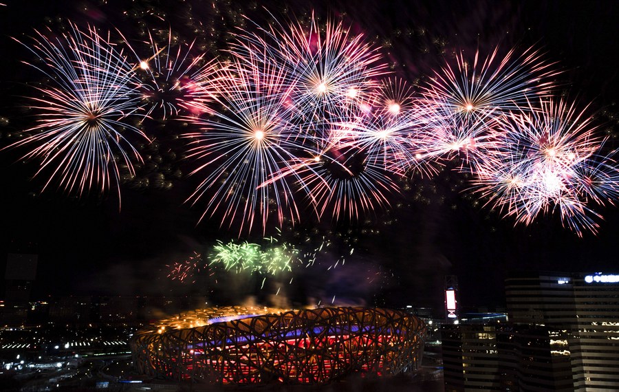 Fireworks illuminate the night sky during the closing ceremony of the 24th Olympic Winter Games at the National Stadium in Beijing, Feb. 20, 2022. (Xinhua/Wu Huiwo)