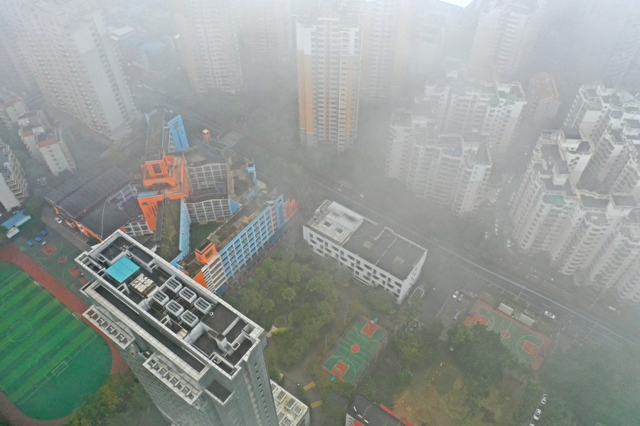 Aerial photo taken on Feb. 12, 2022 shows the view of Nanning City in rain and mist, south China's Guangxi Zhuang Autonomous Region. (Xinhua/Zhou Hua)