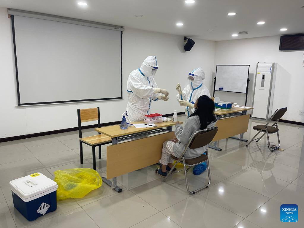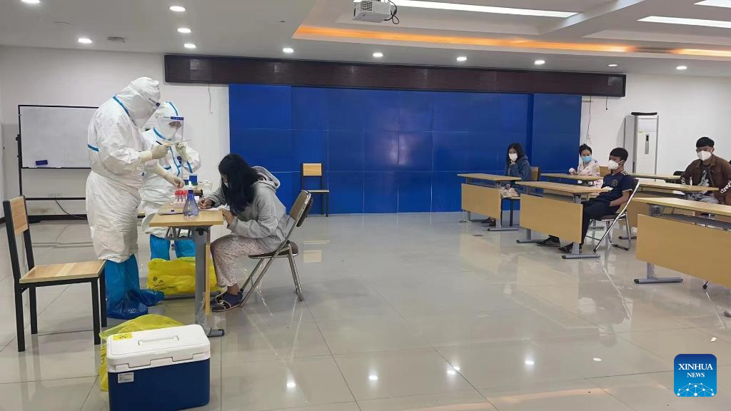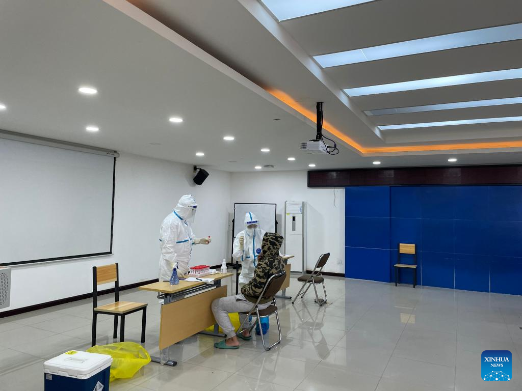 A team of Chinese medical personnel provide emergency testing services at the training center of the China-Laos Railway, in Lao capital Vientiane on Feb. 19, 2022, contributing to the railway's safe and stable operation. (Photo by Yang Sheng/Xinhua)