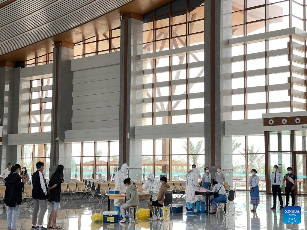A team of Chinese medical personnel provide emergency testing services at the Vientiane station of the China-Laos Railway, in Lao capital Vientiane on Feb. 19, 2022, contributing to the railway's safe and stable operation. (Photo by Yang Sheng/Xinhua)