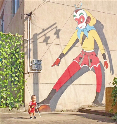 Photo shows a child playing in front of a wall adorned with a painting of the Monkey King, in Xicun village in Ningguo, a county-level city in east China’s Anhui Province. (Photo/Wang Wenqi)