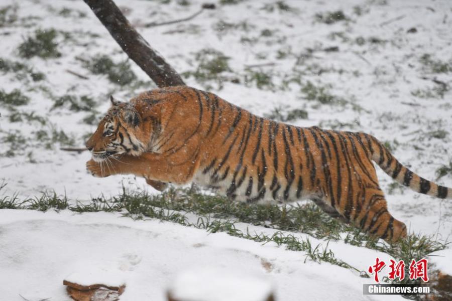 Two Siberian tigers have a good time in the snow at Yunnan Wild Animal Park in Kunming, southwest China's Yunnan Province, Feb. 22 , 2022. (Photo: China News Service/Liu Ranyang)