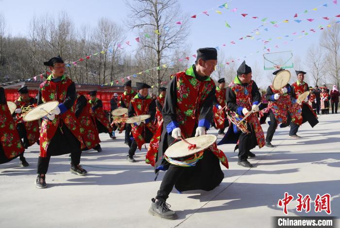 Local dancers perform "Biangbiang Dance", a traditional folk dance of China's Tu ethnic group, in Haidong City, northwest China's Qinghai Province, Feb. 22, 2022. (Photo: China News Servince/Ma Mingyan)