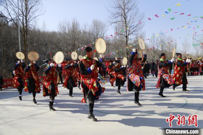 Local dancers perform "Biangbiang Dance", a traditional folk dance of China's Tu ethnic group, in Haidong City, northwest China's Qinghai Province, Feb. 22, 2022. (Photo: China News Servince/Ma Mingyan)