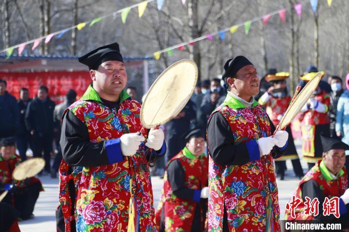 Local dancers perform "Biangbiang Dance", a traditional folk dance of China's Tu ethnic group, in Haidong City, northwest China's Qinghai Province, Feb. 22, 2022. (Photo: China News Servince/Ma Mingyan)