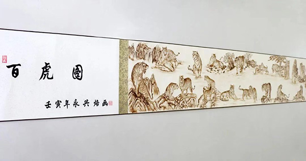 A folk artist has painted 100 tigers in different postures using iron painting techniques on a huge piece of Xuan paper, a material specially made for traditional Chinese painting, with the artwork conveying a message of strength and bravery in the Year of the Tiger.