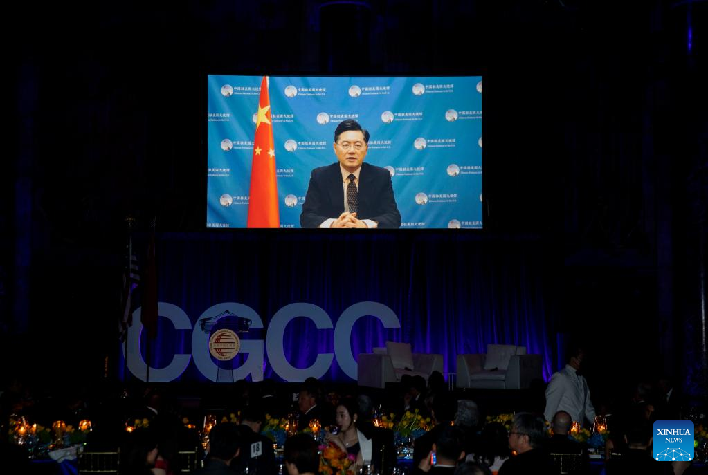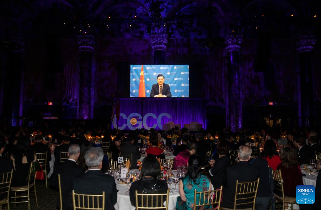 Chinese Ambassador to the United States Qin Gang delivers a video speech during the annual New Year gala of the China General Chamber of Commerce-USA (CGCC-USA) in New York, the United States, Feb. 22. 2022. (Xinhua/Wang Ying)