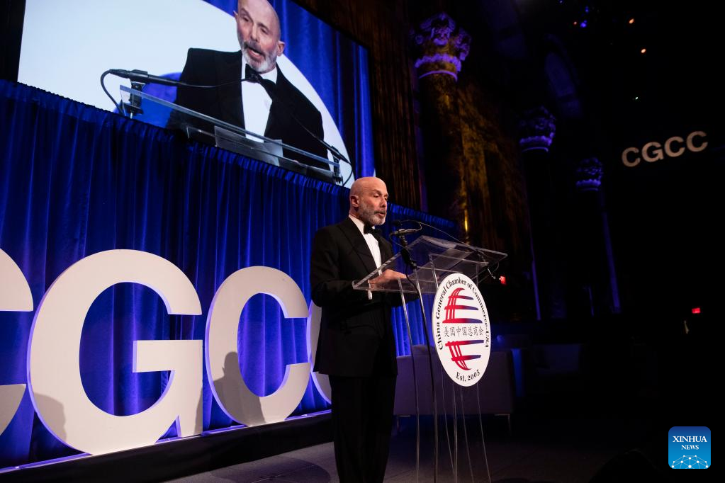 Evan Greenberg, chairman and chief executive officer (CEO) of the insurance company Chubb Limited, speaks during the annual New Year gala of the China General Chamber of Commerce-USA (CGCC-USA) in New York, the United States, Feb. 22. 2022. (Xinhua/Wang Ying)