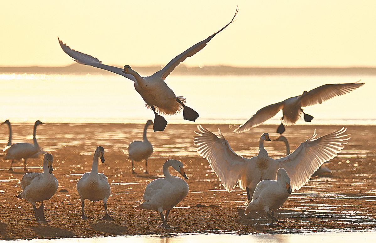 Whooper swans prepare for their migration to Siberia in Rongcheng on Wednesday. [Photo by YANG ZHILI/FOR CHINA DAILY]