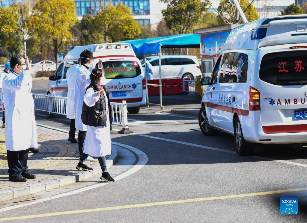 Medical workers wave to the cured patients at a designated hospital for COVID-19 patients in Suzhou, east China's Jiangsu Province, Feb. 24, 2022. Four cured COVID-19 patients were discharged from hospital in Suzhou on Thursday, and then they were transferred to a rehabilitation hospital. (Xinhua/Ji Chunpeng)