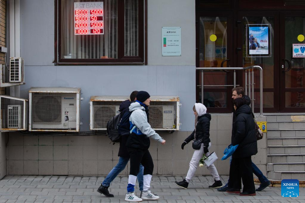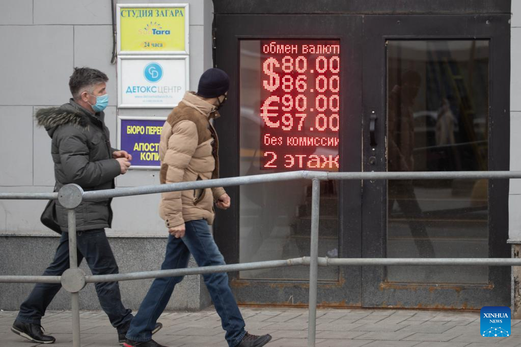 People pass by an electronic board showing the exchange rates in Moscow, Russia, on Feb. 24, 2022. The Russia's rouble exchange rate plunged after Russia launched military operations in Donbass. (Xinhua/Bai Xueqi)