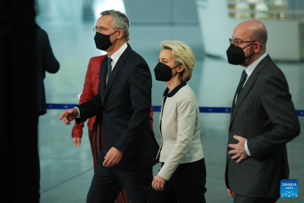 Secretary-General of the North Atlantic Treaty Organization (NATO) Jens Stoltenberg (L) , European Commission President Ursula von der Leyen (C) and European Council President Charles Michel prepare to attend a press conference at NATO headquarters in Brussels, Belgium, Feb. 24, 2022. (Xinhua/Zheng Huansong)