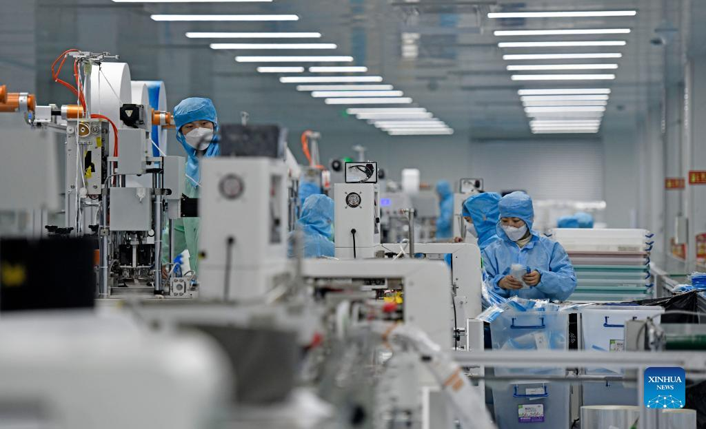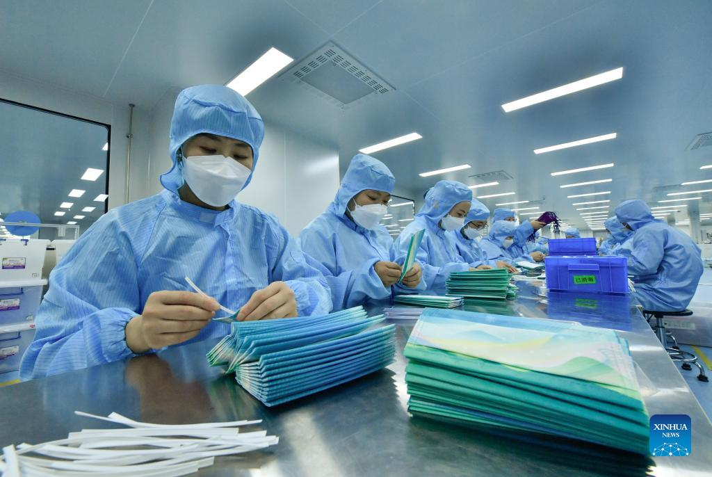 Staff members work at a workshop of Naton Medical Protective Equipment (Tianjin) Co., Ltd. in Tianjin, north China, Feb. 23, 2022. Masks with Chinese elements have been used at the Beijing 2022 Olympic Winter Games. The design of these N95 masks is inspired by the motives as colors of the Olympic rings, the patterns of the snow-covered Great Wall and mountains in Beijing's Yanqing District, and the lines of the National Speed Skating Oval. (Xinhua/Sun Fanyue)