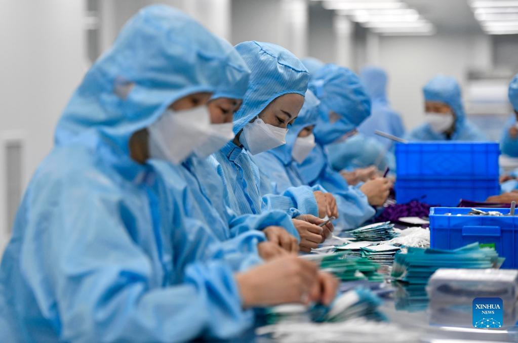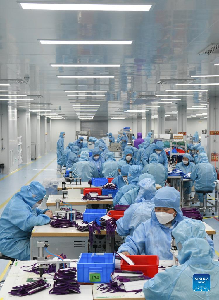 Staff members work at a workshop of Naton Medical Protective Equipment (Tianjin) Co., Ltd. in Tianjin, north China, Feb. 23, 2022. Masks with Chinese elements have been used at the Beijing 2022 Olympic Winter Games. The design of these N95 masks is inspired by the motives as colors of the Olympic rings, the patterns of the snow-covered Great Wall and mountains in Beijing's Yanqing District, and the lines of the National Speed Skating Oval. (Xinhua/Zhao Zishuo)