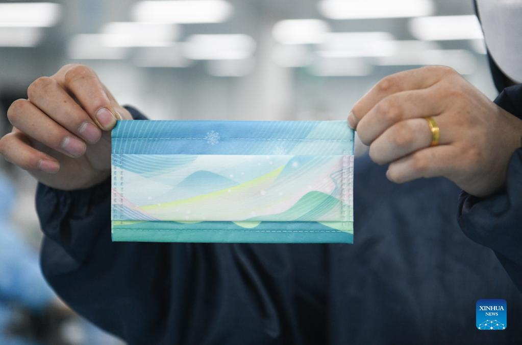 Photo taken on Feb. 23, 2022 shows a mask designed with Chinese elements at a workshop of Naton Medical Protective Equipment (Tianjin) Co., Ltd. in Tianjin, north China. Masks with Chinese elements have been used at the Beijing 2022 Olympic Winter Games. The design of these N95 masks is inspired by the motives as colors of the Olympic rings, the patterns of the snow-covered Great Wall and mountains in Beijing's Yanqing District, and the lines of the National Speed Skating Oval. (Xinhua/Sun Fanyue)