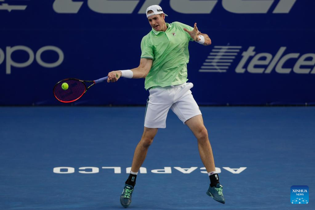 Stefan Kozlov of the United States hits a return during the men's singles round of 16 match against Rafael Nadal of Spain at the 2022 ATP Mexican Open tennis tournament in Acapulco, Mexico, Feb. 23, 2022. (Xinhua/Xin Yuewei)
