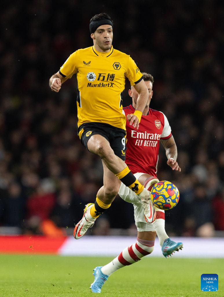 Wolverhampton Wanderers' Raul Jimenez (L) vies for the ball during the English Premier League match between Arsenal and Wolverhampton Wanderers in London, Britain, on Feb. 24, 2022. (Xinhua)