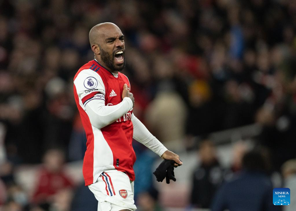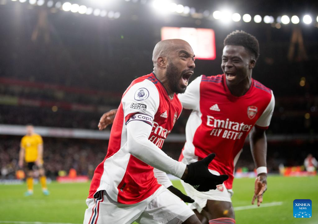 Arsenal's Alexandre Lacazette celebrates after scoring during the English Premier League match between Arsenal and Wolverhampton Wanderers in London, Britain, on Feb. 24, 2022. (Xinhua)