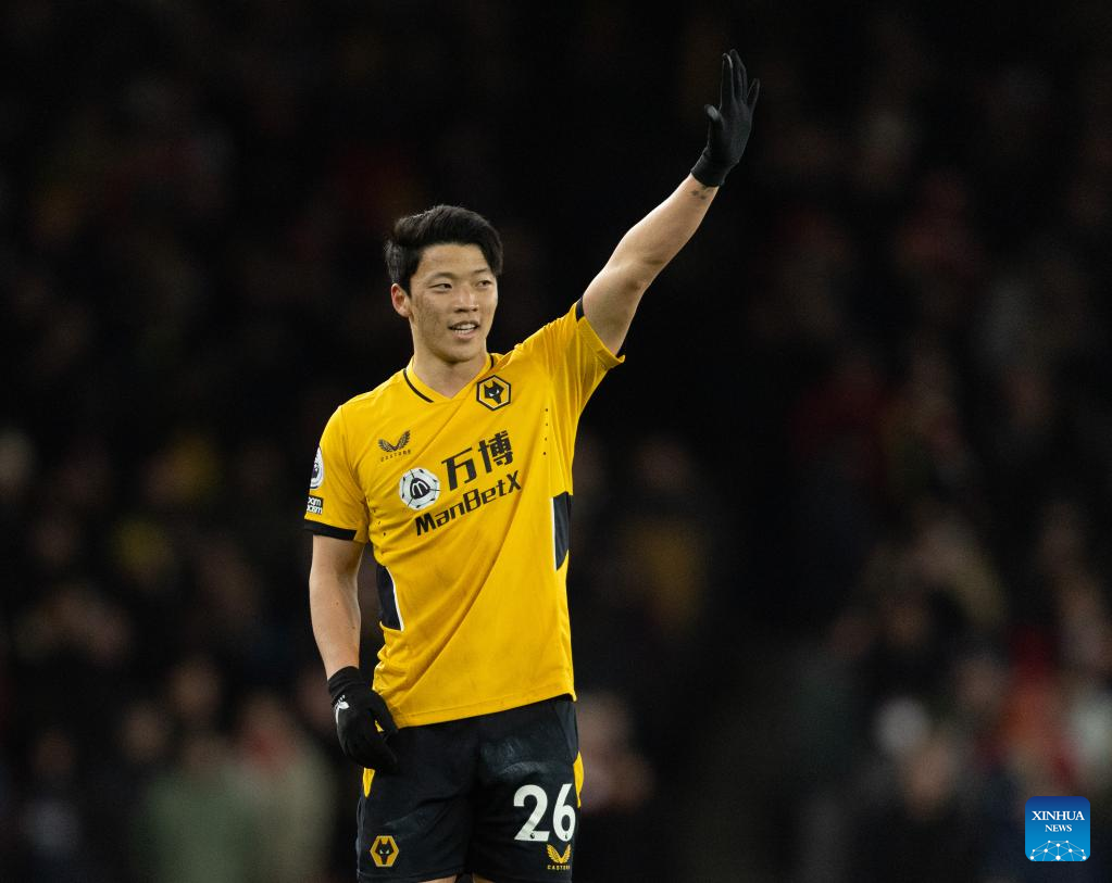 Wolverhampton Wanderers' Hwang Hee-Chan gestures during the English Premier League match between Arsenal and Wolverhampton Wanderers in London, Britain, on Feb. 24, 2022. (Xinhua)
