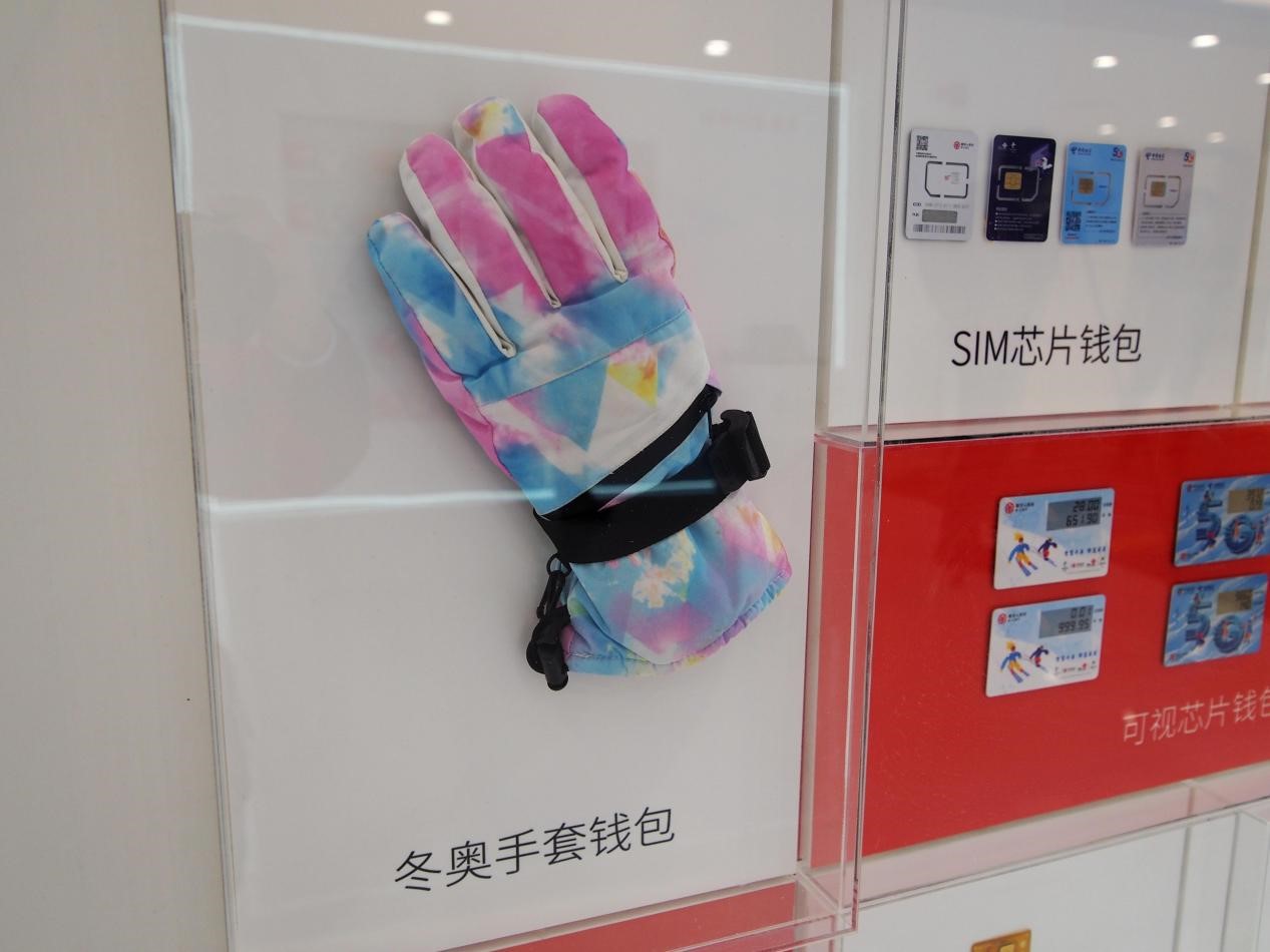 Photo taken on Oct. 21, 2021 shows Beijing 2022 Winter Olympics-themed glove for digital Chinese yuan (e-CNY) payment displayed at an exhibition of China’s digital fiat currency at the Games. (People’s Daily Online/Du Jianpo)