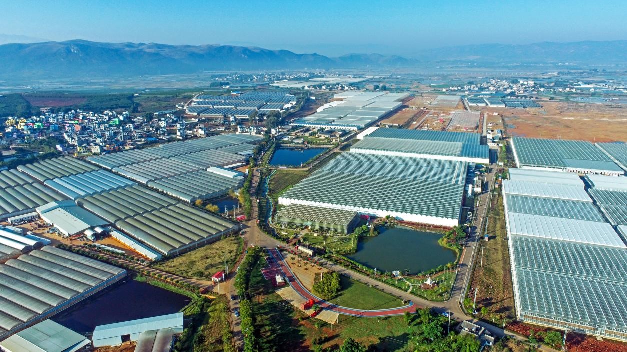 Photo taken on Dec. 8, 2021, shows an aerial view of the flower greenhouses at the national modern agricultural industrial park in Kaiyuan city, southwest China’s Yunnan province. (People’s Daily Online/Zhang Hongke)