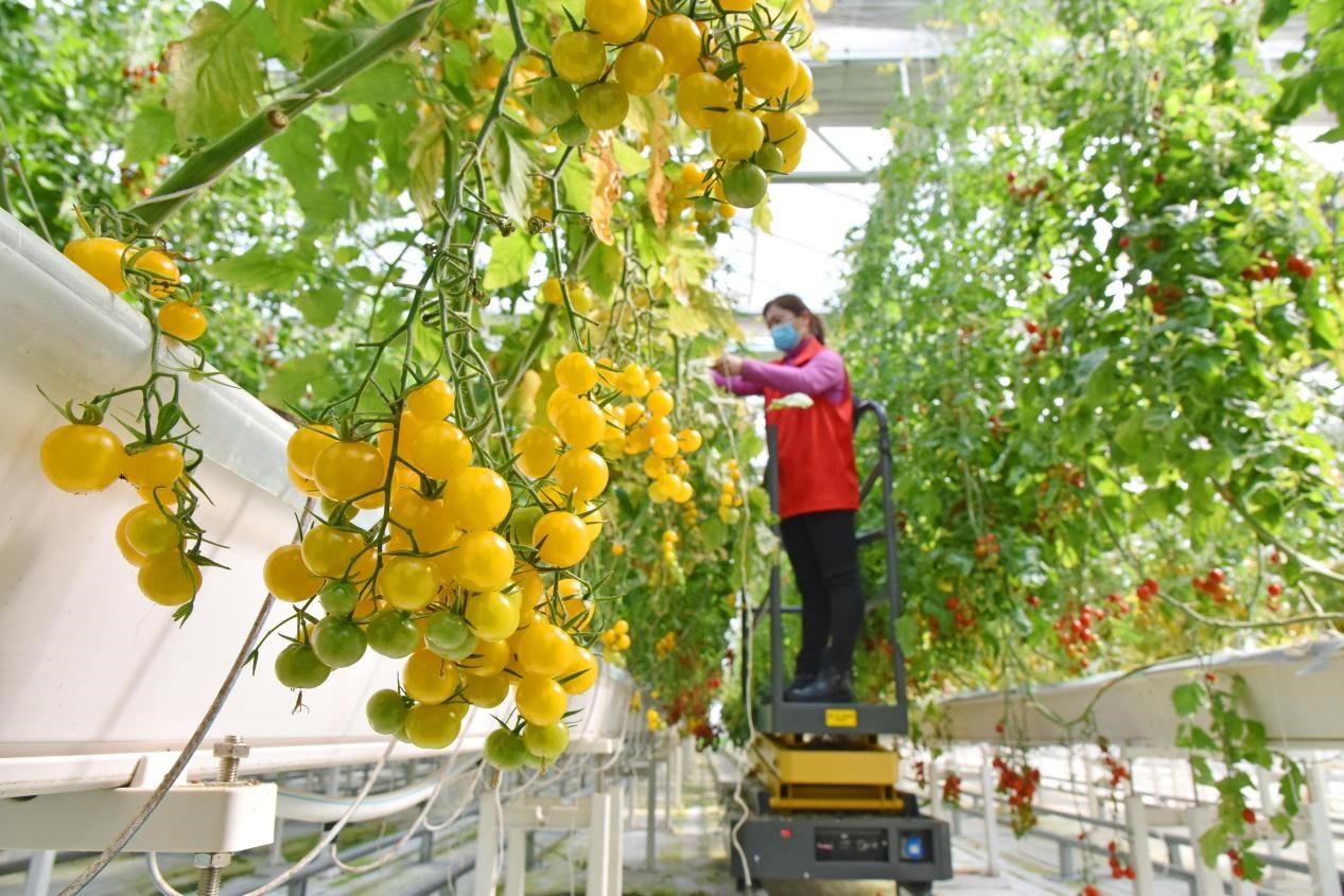 A worker takes care of cherry tomato seedlings at a digital agriculture demonstration park in Suining county, Xuzhou city, east China’s Jiangsu province, Feb. 22, 2022. (People’s Daily Online/Sun Jingxian)