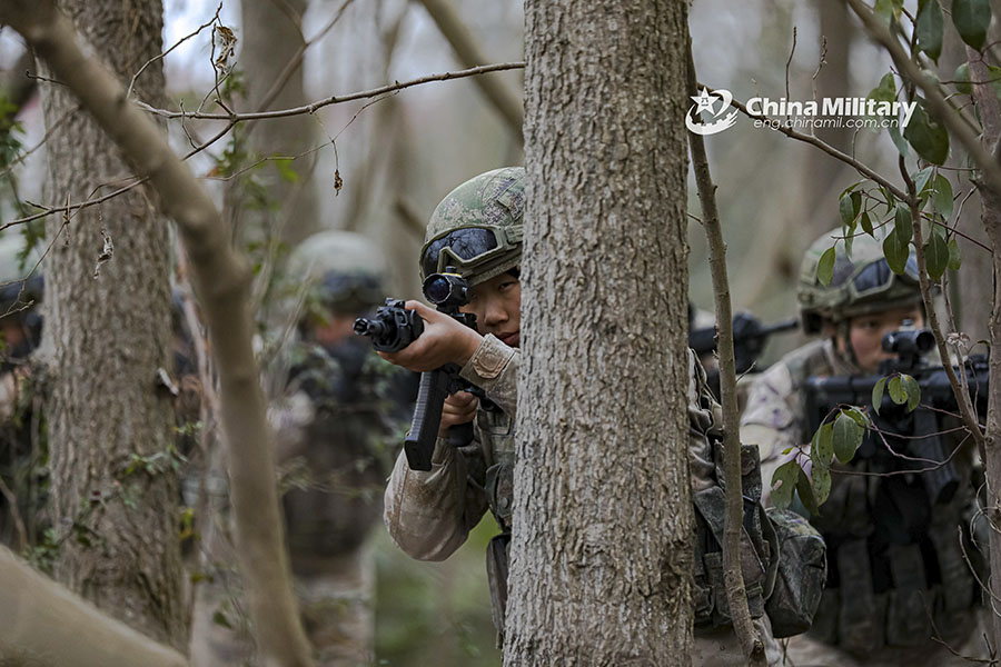 Soldiers assigned to an all-female special operations element of the Leishen (Thor) Commando Unit with the PLA airborne force provide cover for each other in turn during a hostage rescue training exercise recently.(eng.chinamil.com.cn/Photo by Yang Yuewang)