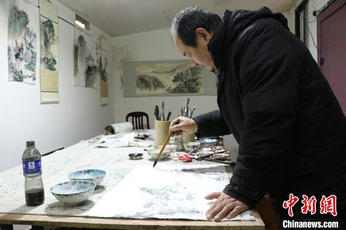 Shen Jianjiang busies himself painting one of his creations inside his studio. (Photo/Wei Yanran)