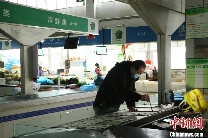 Shen Jianjiang takes a spare moment from his workday to paint while attending to his fish stall. (Photo/Wei Yanran)