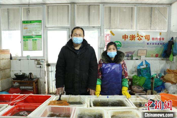 Photo shows Shen Jianjiang and his wife in front of their fish stall. (Photo/Wei Yanran)