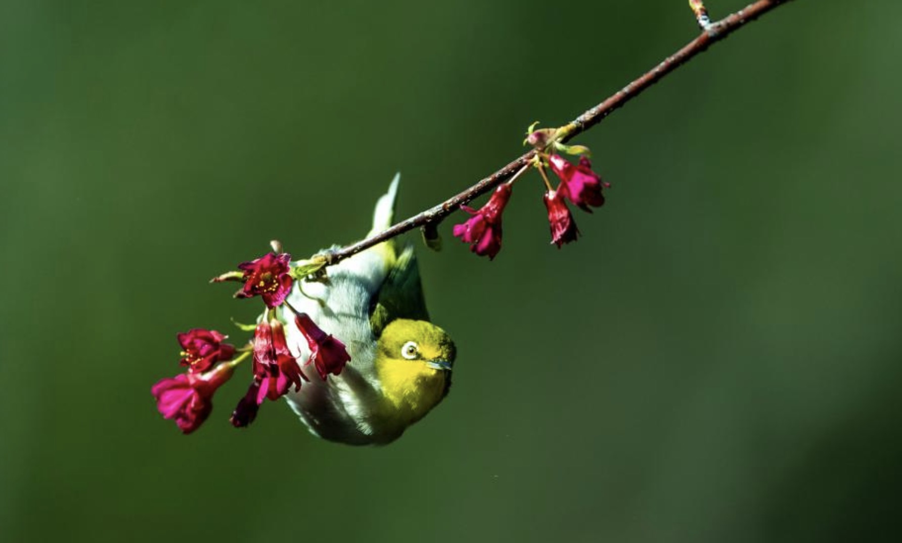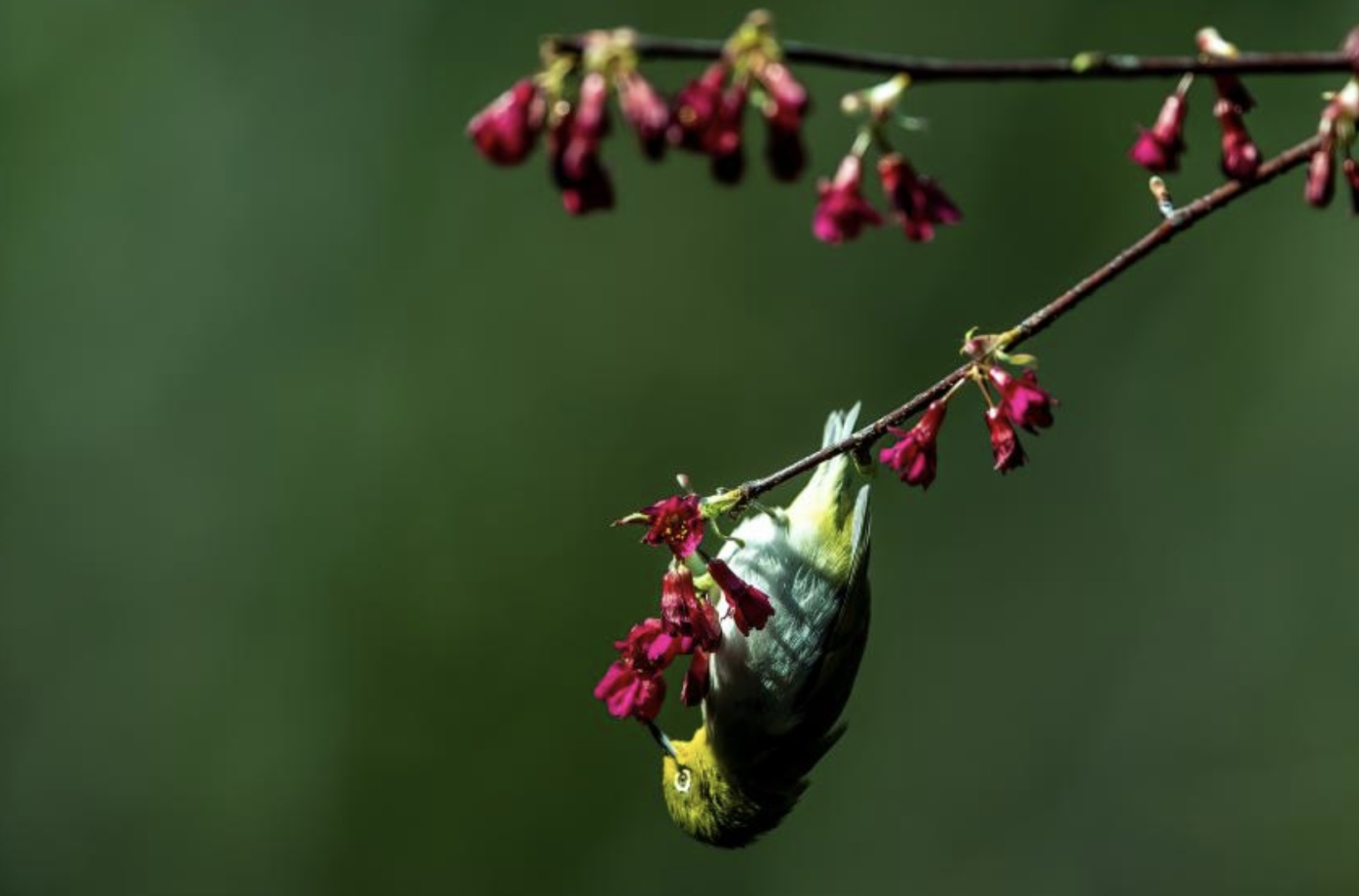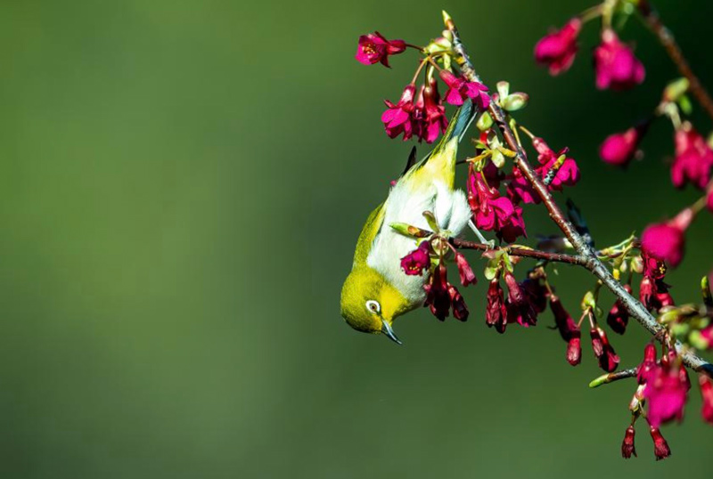 Photo taken on Feb. 24, 2022 shows a bird sucking nectar from a cherry blossom in Fuzhou, capital of southeast China's Fujian Province. (Xinhua/Mei Yongcun)