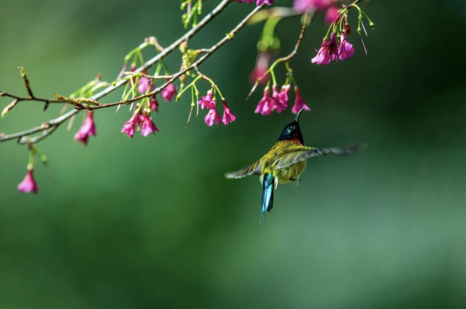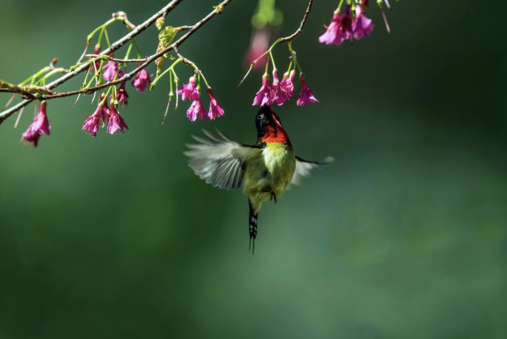 Photo taken on Feb. 24, 2022 shows a bird flying amid cherry blossoms in Fuzhou, capital of southeast China's Fujian Province. (Xinhua/Mei Yongcun)