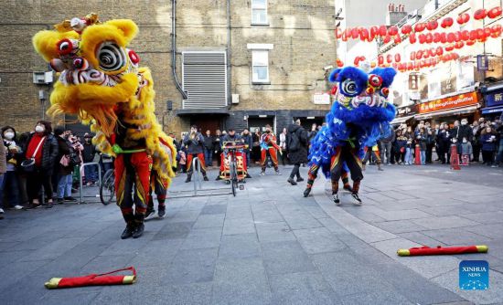 Artists perform a traditional Chinese lion dance after the screening of Chinese animation "I Am What I Am" in London, Britain, on Feb. 26, 2022. Unfolding from a brief introduction to lion dance, a centuries-old Chinese folk dance mostly performed to celebrate Lunar New Year, the movie "I Am What I Am" follows an underdog teenager in Guangdong, southern China, as he joins hands with two friends to pursue a dream against all odds -- becoming the best lion dance performer. (Xinhua/Li Ying)